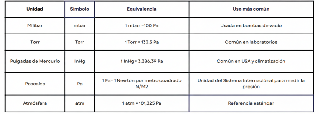Aunque la unidad oficial es el Pascal (Pa), en la práctica se utilizan otras más fáciles de interpretar como el mbar, Torr o micrones, dependiendo de la industria o aplicación.